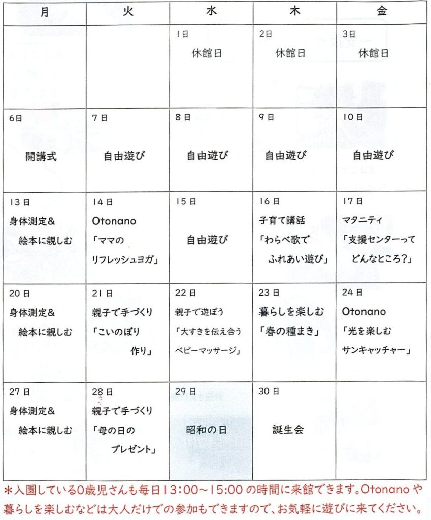 暖かな日差しに雪解けが進み、あちらこちらで春の芽吹きを感じられる季節となりました。今年度のこひつじのおうちも、親子で様々なことを楽しみ、リフレッシュできる憩いの場となるよう計画していきます。新たな取り組みとして、月1回ベビーマッサージを始めます。赤ちゃんとのスキンシップやパパママのリフレッシュにもなりますので、ぜひ遊びに来て下さいね♪一年間よろしくお願い致します。