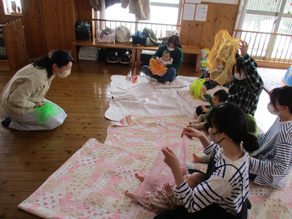 昔ながらの心地よいリズムで、たっぷり触れ合ってみませんか?わらべ歌を歌いながら優しく触れたり、シフォンを使ったりする遊びは、発達にもとてもいいと言われています。難しいルールもありませんのでお気軽に遊びに来て下さいね♪