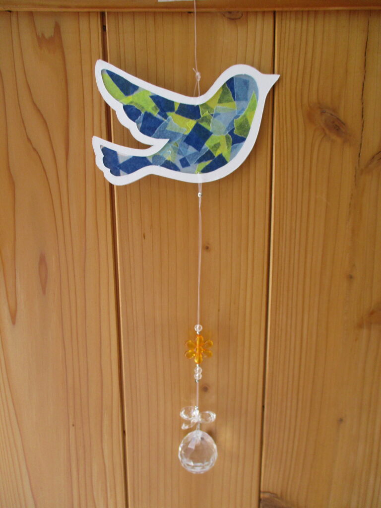 サンキャッチャーに光が当たるときれいな虹がお部屋に広がります♪ちぎり絵とビーズの飾りで素敵なサンキャッチャーを作りませんか。